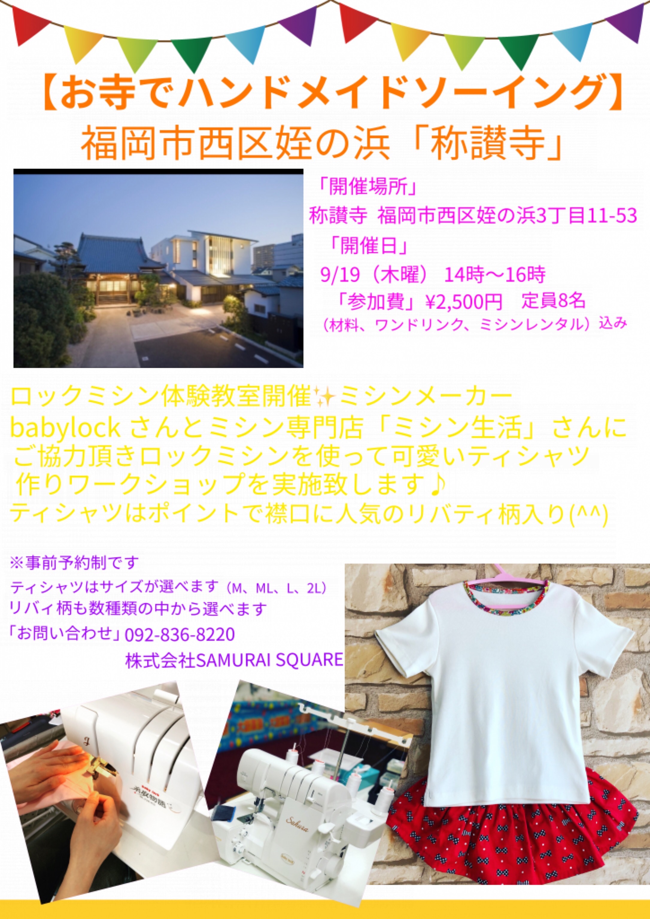 先月9月に福岡市西区姪の浜お寺【称讃寺】にてイベント「お寺でハンドメイド♪ソーイング」がミシンメーカーbabylock さんとミシン専門店のミシン生活さんに協賛頂いて開催されました✨
