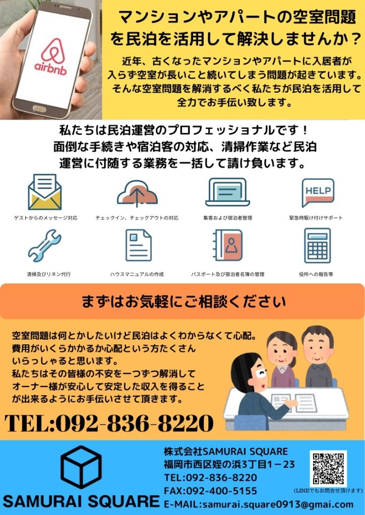 2020年も宜しくお願いいたします 投稿者:noexcuse2020年1月19日カテゴリー:福岡、SAMURAI SQUARE、姪の浜、未分類、不動産業、住宅宿泊管理業者タグ:サムライスクエア、福岡、福岡市西区、SAMURAISQUARE、姪の浜、姪浜、株式会社サムライスクエア、民泊、民泊運用、民泊運営、民泊運営代行、令和2年、住宅宿泊管理業者