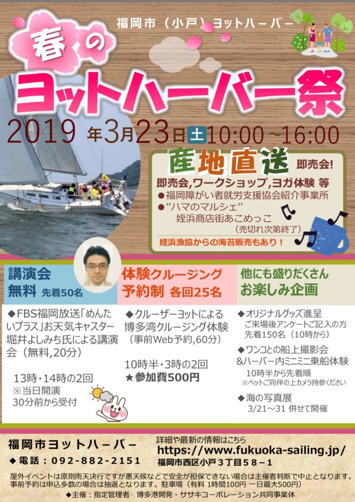 福岡市西区小戸にある福岡市ヨットハーバーにて3月23日(土曜)に【春のヨットハーバー祭】が開催されます♪
