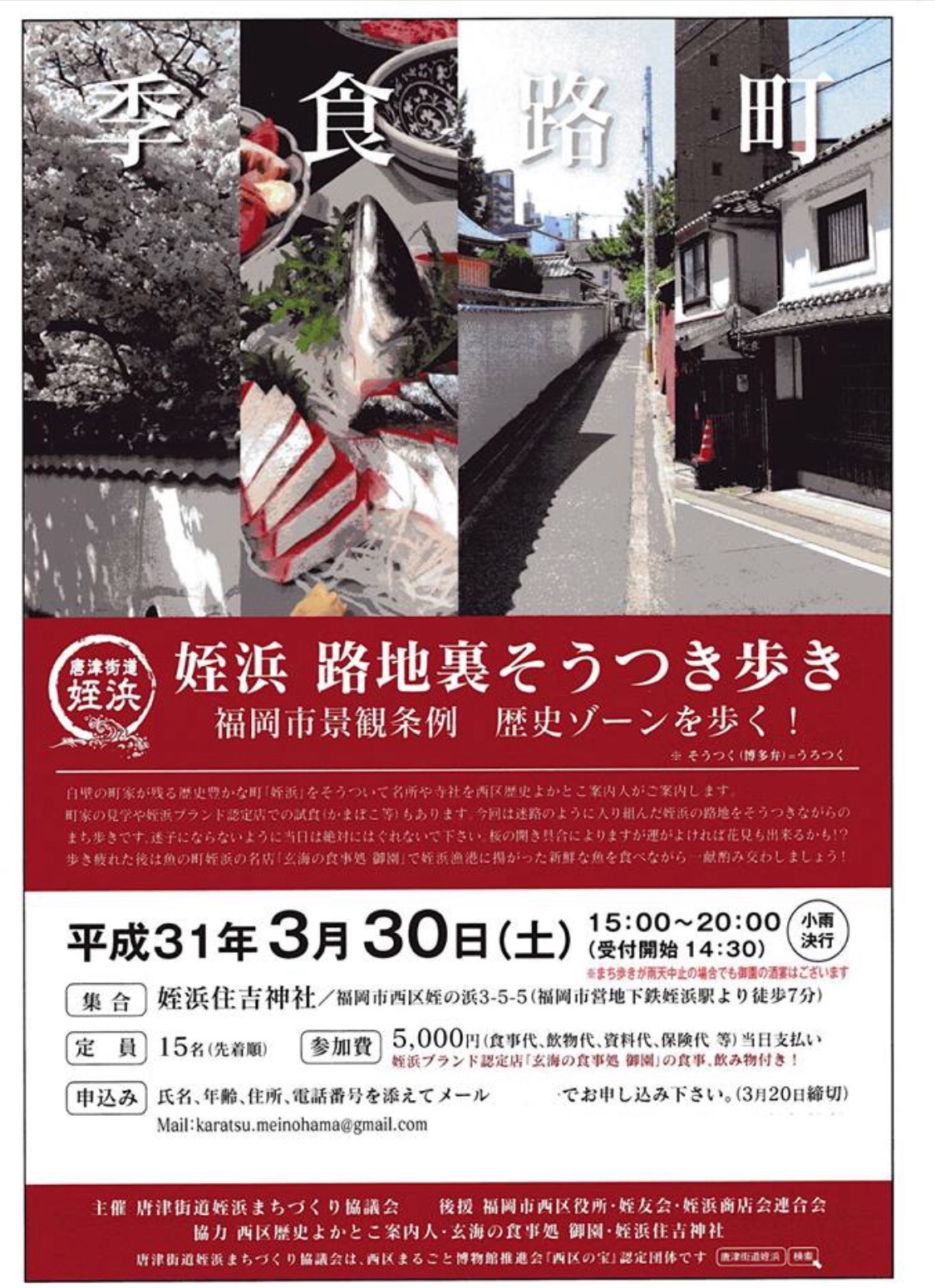 平成31年3月30日(土曜)15時~20時 お申込みは唐津街道姪浜まちづくり協議会までお問い合わせ下さい♪