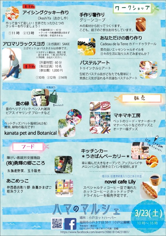 会場内では、ハマのマルシェも開催されます☆ ワークショップやヨガ、体験クルージングや海の写真展など大人から子供まで幅広い年代の皆様にご家族で楽しんで頂ける内容になっております^-^